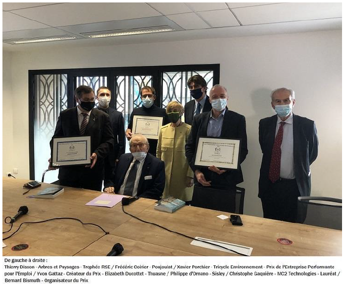 Le Prix Yvon Gattaz, lancé en 2020, s’adresse à des PME dirigées par leurs créateurs, dont l’objectif est de créer des emplois en France et de répondre à la devise du prix « Start c’est bien, Up c’est mieux ».Ce prix, qui sera remis pendant les 8 années à venir, compte cette année 25 candidatures passionnantes, très diverses, comprenant des produits ou services innovants, porteuses du futur et avec des équipes dirigeantes engagées.Le prix Yvon Gattaz (remis en principe à l’Ecole CentraleSupélec) se tenait ce jour, jeudi 4 Février 2021, dans les locaux de Sisley dont le Président Philippe d’Ornano est membre du Jury.Pierre Gattaz, au nom de la famille Gattaz, présidait la cérémonie de remise des prix avec l’appui de Elizabeth Ducottet de Thuasne, Frédéric Coirier de Poujoulat, Bernard Bismuth, organisateur du prix, et Romain Soubeyran, Directeur de CentraleSupélec.La remise a été précédée par un débat sur les ETI devant les étudiants de CentraleSupélec réunis pour la « Start Up Week ». Après une courte présentation de toutes les candidatures et une intervention des 3 finalistes, le « Prix Yvon Gattaz » était décerné à MC2 Technologies par Pierre Gattaz.Cette entreprise, spécialiste en micro et nanotechnologies, propose des produits dans le domaine de la sécurité comme le brouilleur de drones et scanner corporel.Les deux autres prix, le « Trophée RSE du Jury » et le « Prix Entreprise Performante pour l’emploi » étaient remis respectivement à Arbres et Paysages et à Tricycle Environnement.Arbres et Paysages s’occupe de l’entretien paysager, de la conception, de l’aménagement ainsi que de l’élagage et des soins aux arbres.Tricycle Environnement assure la collecte et le recyclage des déchets professionnels et est aussi une entreprise d’insertion partenaire de l’économie sociale et solidaire à Gennevilliers.Ces trois entreprises ont des croissances d’emploi importantes et espèrent bientôt devenir des ETI en comptant au moins 250 salariés. Plus d’informations sur : https://www.prix-yvongattaz.com/ Contact presse : contact@prix-yvongattaz.com