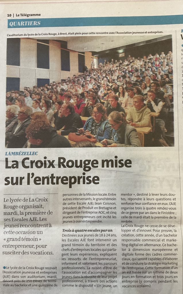 Club Aje Finistère fait Escale … à #brest avec le lycée La Croix Rouge La Salle BrestDevant près de 260 jeunes en auditoire (Mission Locale Morlaix Terminales STMG, SES, BTS MCO, Bachelor Responsable Commercial et Marketing Digital) des témoins de l’entreprise et du monde économique local (UNiK Informatique Produit en Bretagne LeGroupe Kerne GRENAT Solution Ava Autostore SILVER ACCESS BeAble AOC Marketing Stratégique) ont mis à l’honneur leur parcours, leur mission et leur vision de l’entrepreneuriat.Témoignage de Jean Coisnon(Président de Produit en Bretagne et AOC Marketing) : » 𝐿𝑒 𝓅𝓁𝓊𝓈 𝒾𝓂𝓅𝑜𝓇𝓉𝒶𝓃𝓉, 𝒸𝑒 𝓆𝓊𝒾 𝒻𝒶𝒾𝓉 𝓁𝒶 𝒹𝒾𝒻𝒻é𝓇𝑒𝓃𝒸𝑒 𝒸’𝑒𝓈𝓉 𝓁’𝑜𝓊𝓋𝑒𝓇𝓉𝓊𝓇𝑒, 𝓁𝒶 𝒸𝓊𝓇𝒾𝑜𝓈𝒾𝓉é 𝑒𝓉 𝓁𝒶 𝓈𝑜𝒾𝒻 𝒹’𝒶𝓅𝓅𝓇𝑒𝓃𝒹𝓇𝑒. 𝒞𝑒𝓁𝒶 𝓋𝒶 𝒸𝓇é𝑒𝓇 𝒹𝑒𝓈 𝑜𝓅𝓅𝑜𝓇𝓉𝓊𝓃𝒾𝓉é𝓈 »