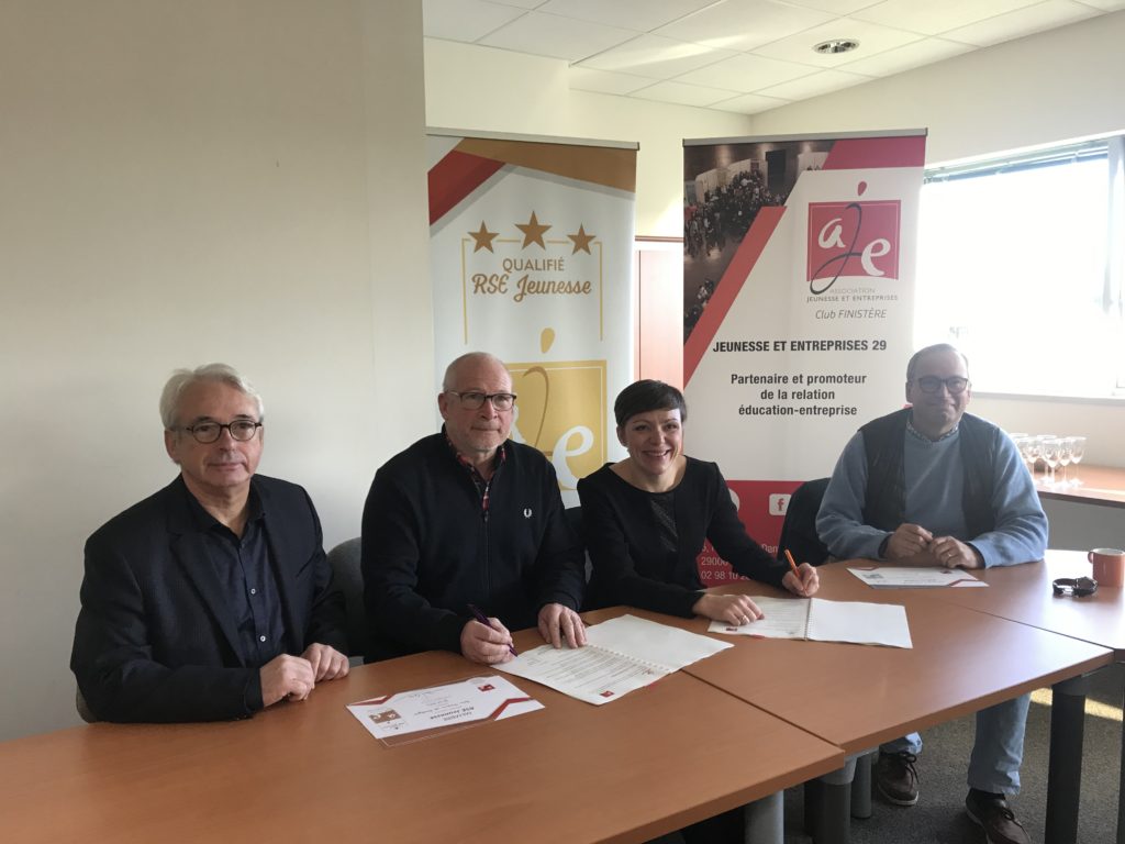 Notre président, Paul Puech, Françoise Foll vice-présidente, Magali Penven déléguée Club Aje Finistère ainsi que nos 2 Volontaires en service civique Lisa Quinquis et Suzie Le Berre ont présenté ce matin, lors d’une conférence de presse la RSE Jeunesse AJE 29. L’association travaille à rapprocher les jeunes des entreprises en s’appuyant sur un réseau de bénévoles d’entrepreneurs et de professionnels de l’éducation. AJE a rassemblé dans une Box l’ensemble des outils qu’elle peut mettre à disposition des entreprises, des actions dans lesquelles elles peuvent s’inscrire (témoignages en classe, visites d’entreprises…) Des adhérents étaient présents Marc Le Bodo et Eva Moisset de Veolia, Diane Gerardin de l’Ifria, Pierre Corre de Corre Finance et Stratégies ainsi que Marc Voisard de Mission Locale du Pays de Cornouaille.