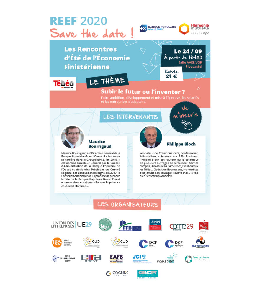 AJE Finistère est cette année aux côtés des fédérations professionnelles et des clubs entreprises dans l’organisation de la grande journée REEF du 24 septembre 2020. L’après-midi, un temps fort a été organisé avec Philippe Bloch (chroniqueur, auteur, créateur de Colombus café) et les élèves de terminales du Groupe Estran (partenariat Groupe Estran, AJE 29 et UE 29). Dès 17h00 les participants de la REEF ont pu suivre une table ronde ainsi que les interventions de Muriel Pénicaud OCDE), Maurice Bourrigaud (BPGO), Loïg Chesnais Girard (Région Bretagne) sur le thème :SUBIR LE FUTUR ou L’INVENTER ?Philippe Bloch a clôturé la soirée avec une conférence.