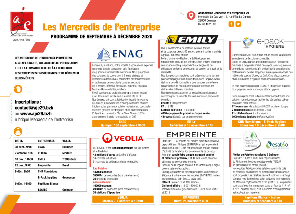Programme de septembre à décembre 2020. Les inscriptions aux visites se font via le site internet (bouton « les mercredis de l’entreprise »), nous ne manquerons pas de vous confirmer votre inscription : vérifiez bien les dates et horaires. Ces visites sont réservées aux enseignants, responsables d’établissement, conseillers d’orientation et d’insertion. Environ 10 jours avant chaque visite, nous vous adressons un message de rappel. En cas de désistement, merci de nous en informer au plus tôt.