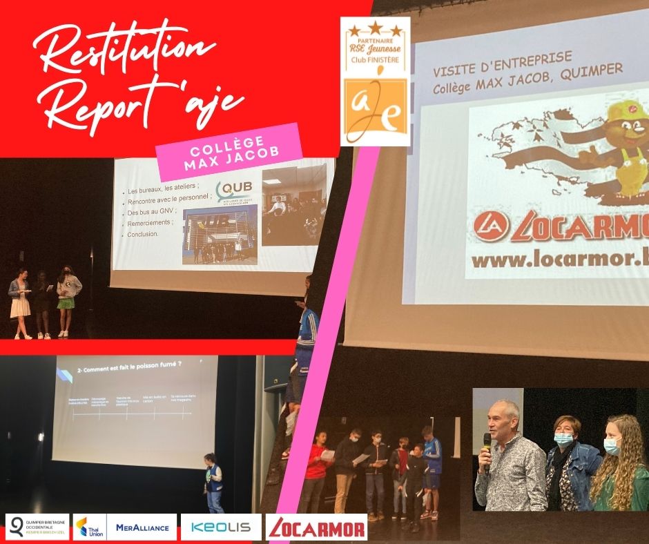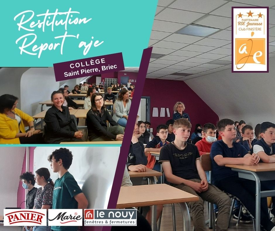 C’était au tour des élèves de 4ème du Collège Saint-Pierre Briec de faire la restitution de leurs report’AJE.L’AJE Finistère Association Jeunesse Entreprises avait associé 3 classes de 4ème à 3 entreprises; Biscuit Panier, MARIE – Groupe LDC et Le Nouy Fenêtres & FermeturesLes élèves ont fait preuve de créativité avec des productions originales qui retraçaient leurs expériences ;> une publicité pour Panier : « Panier, c’est la pêche assurée ! »> un rap pour Le Nouy : « Le Nouy c’est l’esprit d’équipe / Le Nouy c’est la qualité / Le Nouy c’est la famille… 🙂 »> un journal télévisé pour Marie FraisBravo à eux, à leurs professeurs, aux membres AJE qui ont suivi leur parcours et aux entreprises qui les ont accueillis.