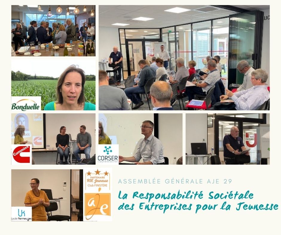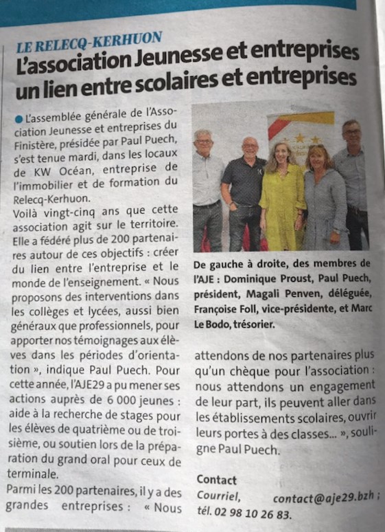 Belle Assemblée Générale hier pour l’AJE 29, chaque année nous nous retrouvons pour ce temps fort sur le site d’une entreprise, pour cette édition Damien Kerebel nous recevait dans son market center Keller Williams Océan – Brest.paul puech, président et Magali Penven, déléguée ont présenté les actions #Ecoles #Entreprises de l’année 2021, avec un bilan de plus de 6500 #jeunes rencontrés par nos membres et 200 entreprises mobilisées sur le terrain.Des témoignages sur la dynamique #RSEJeunesse des entreprises avec les expériences de Lucie Lerat et Yann Lagadic qui ont ouvert les portes de Cummins Inc. à des collégiens de Quimper, Nicolas LE BARS de CORSER qui a témoigné de son parcours de dirigeant auprès d’une assemblée de lycéens et étudiants à Morlaix. Un retour en vidéo sur le lien jeune & entreprise avec l’entreprise Bonduelle Charlotte LE JAOUAN Gwenaelle LE BARBANCHON.sophie MONCOMBLE, Professeur au Lycée Kerneuzec en économie-gestion a exposé les liens et le réseau qu’elle a tissé avec AJE et les entreprises pour ses étudiants (GROUPE KERNE Massilly Laura Guéno GAZARMOR Bonduelle Cadiou Industrie Tiffany Brelivet 🌱) .Un grand merci aux membres du bureau Marc Le Bodo Lydia Villefeu Francoise Foll Anna Szeremeta @proust dominique, aux membres du Conseil d’administration, à nos partenaires, nos adhérents, aux bénévoles, à Logann Cariou Margot Baussan, à Yann Halna Du Fretayà APF Entreprises 3i Concept Briec Gwenaelle KERMARREC Valerie Gloaguen Burnel pour la conception du cadeau reçu par chacun des participants