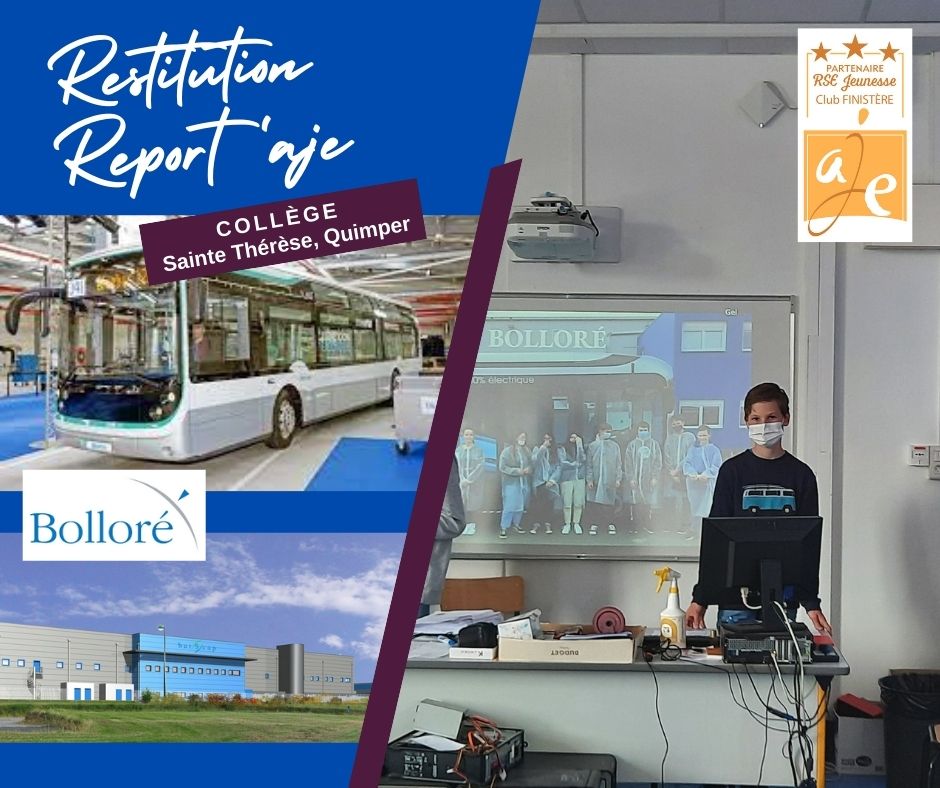 Restitution du Report’AJE en entreprise d’une classe de troisième du collège Sainte Thérèse à Quimper.Les élèves étaient associés à Bolloré à Ergué-Gabéric. Ils ont retracé l’histoire de l’entreprise de son créateur Nicolas Le Marié à Cyrille Bolloré. Chacun a raconté ses découvertes ; métiers, innovation, organisation. Un focus particulier a été fait sur l’usine de bus : »c’est intéressant de voir comment ça marche, ça nous apporte une meilleure compréhension »Merci à eux, à leur professeur Stéphane Blondin ainsi qu’à Lisa Le Moigne et Emmanuelle TRICOT pour leur accueil.