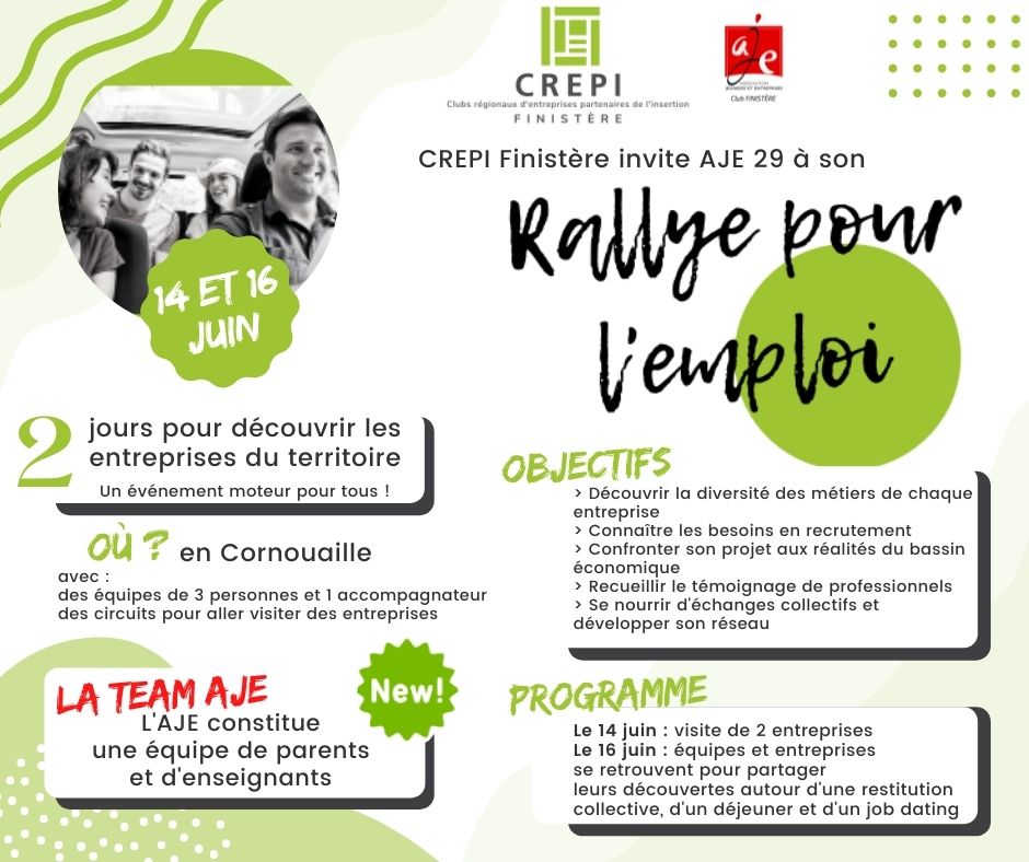 Vous êtes parent ? Enseignant.e ? Vous souhaitez en savoir davantage sur le monde de l’entreprise en Cornouaille ? Attentes, opportunités, métiers, parcours, carrières ?Je vous invite à nous rejoindre aux côtés du #CREPI Finistère les 14 et 16 juin prochain. Nous constituerons un véhicule AJE Finistère Association Jeunesse EntreprisesContact à : contact@aje29.bzh#jeunesse#entreprises#rsejeunesse#cornouaille