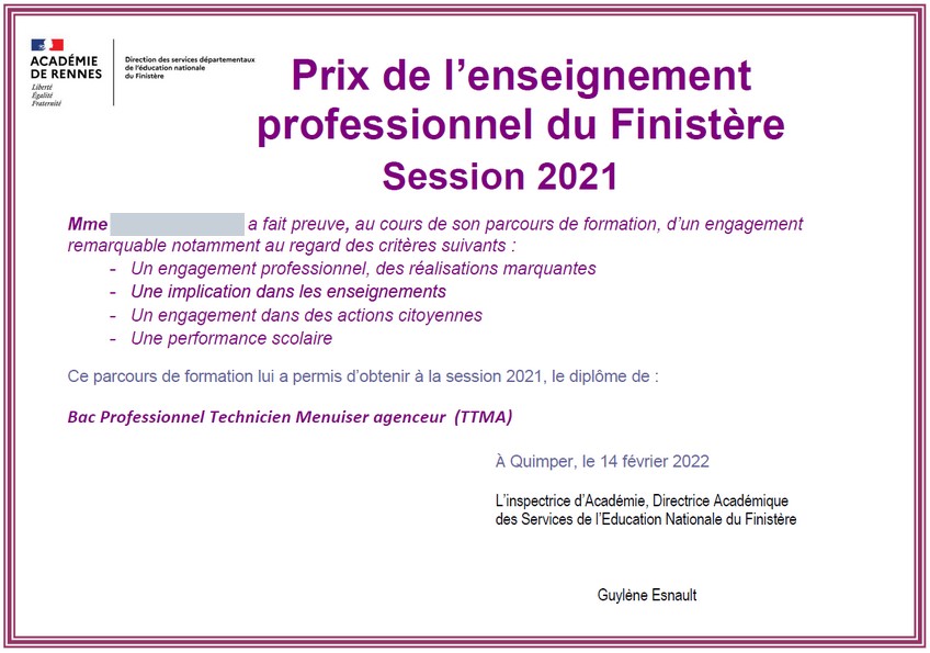 L’AJE Finistère Association Jeunesse Entreprises est fière de remettre, avec la collaboration des établissements scolaires du territoire, du Ministère de l’Éducation nationale, de la Jeunesse et des Sports, de l’Académie de Rennes, de l’Enseignement Catholique du Finistère et du Conseil départemental du Finistère, le Prix de l’Enseignement Professionnel à plus de 50 élèves. La valorisation de la voie professionnelle est une des missions de l’AJE Finistère Association Jeunesse Entreprises Bravo à tou.te.s les jeunes !