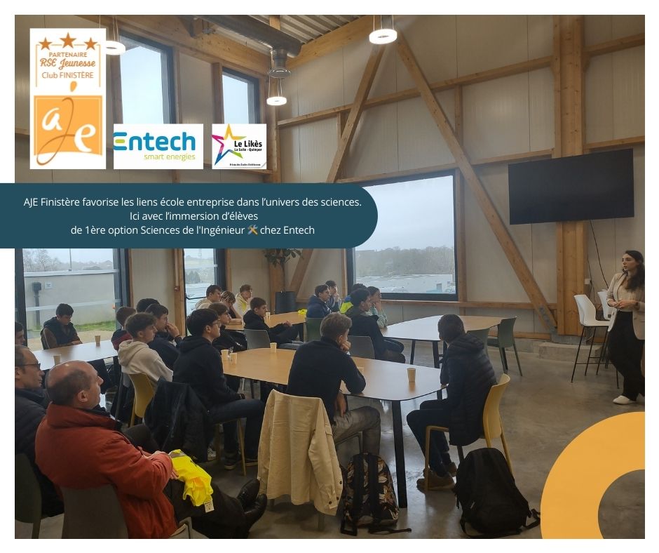 Dans le cadre des actions de l’AJE Finistère Association Jeunesse Entreprises liées aux sciences, orchestrées par des bénévoles AJE : Eric Ponchel, Jean-Christophe BAYETTO et Jean Luc Monfort, les élèves de 1ère Option Sciences de l’Ingénieur du lycée Le Likès – Quimper ont eu l’opportunité de donner du sens à leur enseignement avec une immersion chez Entech smart energies, entreprise Quimpéroise spécialisée dans les énergies renouvelables 🔋. Ils ont partagé une matinée avec trois jeunes ingénieurs passionnés par leur métier 💼. Mathilde Rousseau, ingénieure support avant-vente chez PVUT, met en lumière son domaine d’expertise : » Nous recevons des dossiers de consultations de la part de nos clients développeurs de centrales photovoltaïque au sol, notre rôle est de proposer la meilleure offre technico-commerciale. Notre travail s’étend de la conception technique de la centrale, à la consultation de fournisseurs clés, jusqu’à la préparation du devis et du mémoire technique. 🌞. »Christophe RAMALINGOM, ingénieur R&D contrôle commande et informatique industrielle au sein du bureau d’étude développement informatique : « Mon quotidien oscille entre l’intégration de nouvelles fonctions au logiciel de pilotage et de supervision des systèmes 🖥️et le développement de modèles pour la simulation de ceux-ci afin de valider et quantifier les avantages et inconvénients des solutions de pilotages intégrées. » »Martin BEAUDOUARD, ingénieur R&D axé sur l’étude, la conception et le développement de systèmes d’énergies renouvelables, détaille son rôle : » Je suis chargé de définir le fonctionnement du système et je développe le logiciel qui va permettre de le piloter. Une fois terminé, je suis chargé de tester le système et l’installer chez le client 🏡. »