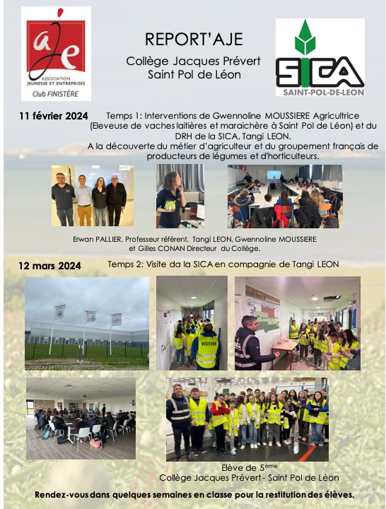 📢 Mardi, Muriel Socheleau, DRH de Savéol à Plougastel Daoulas, est venue présenter la coopérative agricole aux élèves de 2de du Lycée Charles de Foucauld à Brest, en préparation de la visite prévue mardi prochain 🍅👩🌾 💼 🏭Au collège Max Jacob, ce sont 4 classes qui ont plongé dans l’univers de l’entreprise.Au travers de tout un circuit les élèves de 4ème3 ont pu grâce à David Jestin, responsable commercial de l’Imprimerie du Commerce, découvrir le service commercial, la direction artistique, le service PAO, le stockage du papier, l’atelier de production. Une visite très complète et enrichissante, mine d’informations pour la réalisation de leur hashtag#Report’AJE.Les élèves de 4ème2 ont quant à eux, été très bien accueillis au sein de MCA Process. Ils ont visité le bureau de conception mécanique, les ateliers. Des temps d’échange et la présentation du métier de commercial export sont venus compléter la visite.L’entreprise Atmus Filtration Technologies a accueilli les élèves de 4ème 5 pour leur faire découvrir son site de production. La particularité du bâtiment, les lignes robotisées, les normes de sécurité, les process de fabrication. Une belle découverte !Enfin, Michel Valenzuela, responsable d’exploitation chez Veolia, a accompagné les élèves de 4eme4 et leur a permis de découvrir les installations du centre de regroupement des déchets ménagers de Quimper Bretagne Occidentale / Ville de Quimper et de la déchèterie. 🌱 📝 Au collège du Bois de Locquéran à Plouhinec, 82 élèves de 3ème ont restituer leurs hashtag#Report’Aje devant leurs camarades, leurs professeurs et les représentants des entreprises les ayant accompagnés durant tout le processus. Un grand merci à Atmus Filtration Technologies, Maison Cadiou et Coopérative Biocoop, pour leur implication et leur partage. Paul Puech a eu le plaisir de remettre à chacun (classes et entreprises) une attestation en gage de remerciement pour leur implication🌱🎓🙌 Enfin, un grand merci à nos bénévoles, Agnès AURIERES, Gilbert MIGNOT, Jean-Pierre ROUXEL, Didier Enizan et Guillaume FONDIMARE pour leur accompagnement et leur soutien sur ces actions 👏👏👏#jeunesse #education #entreprises #découverte #partage