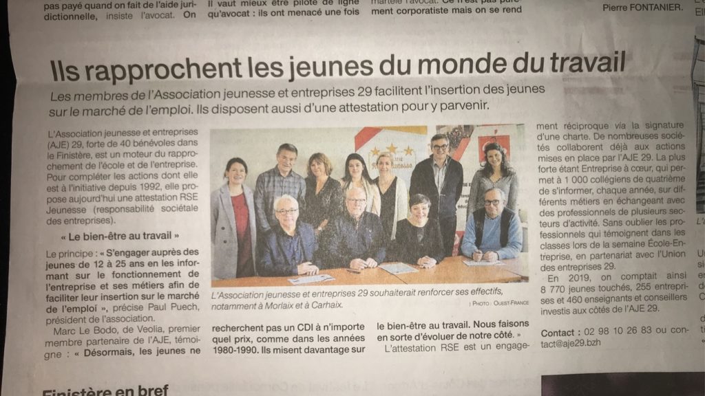Notre président, Paul Puech, Françoise Foll vice-présidente, Magali Penven déléguée Club Aje Finistère ainsi que nos 2 Volontaires en service civique Lisa Quinquis et Suzie Le Berre ont présenté ce matin, lors d’une conférence de presse la RSE Jeunesse AJE 29. L’association travaille à rapprocher les jeunes des entreprises en s’appuyant sur un réseau de bénévoles d’entrepreneurs et de professionnels de l’éducation. AJE a rassemblé dans une Box l’ensemble des outils qu’elle peut mettre à disposition des entreprises, des actions dans lesquelles elles peuvent s’inscrire (témoignages en classe, visites d’entreprises…) Des adhérents étaient présents Marc Le Bodo et Eva Moisset de Veolia, Diane Gerardin de l’Ifria, Pierre Corre de Corre Finance et Stratégies ainsi que Marc Voisard de Mission Locale du Pays de Cornouaille.