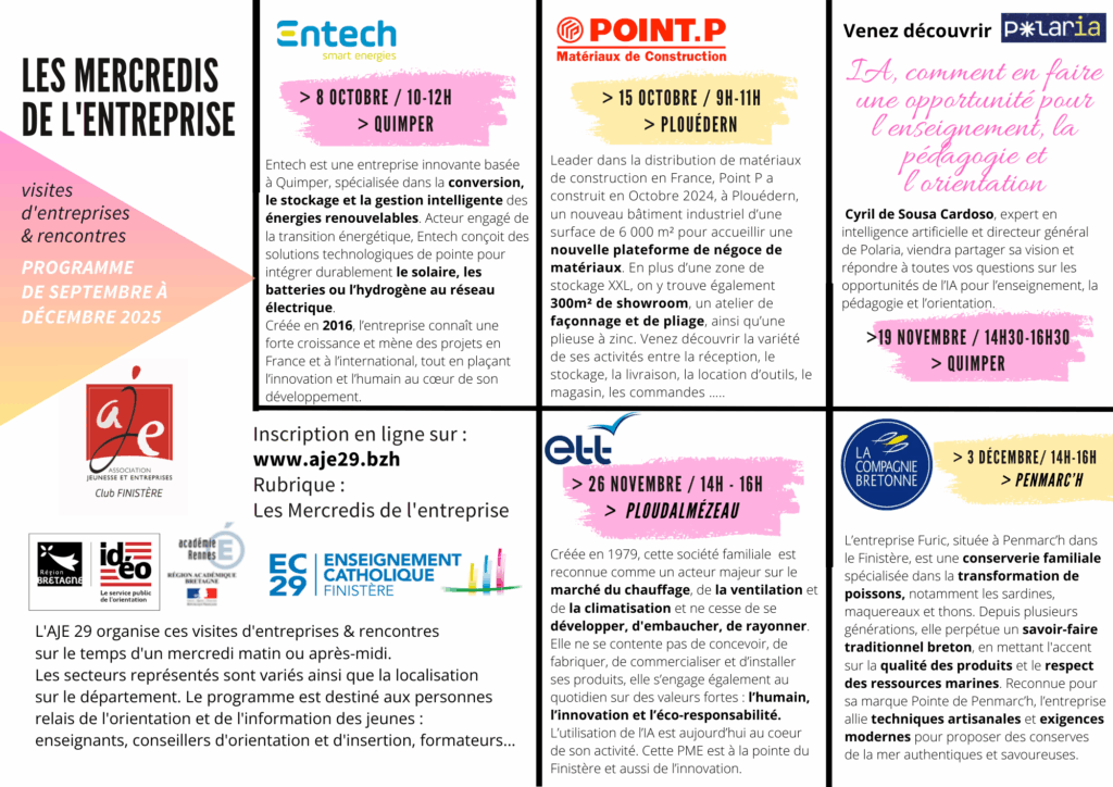 🌟 Lancement de 4 « Report’Aje » avec l’intervention des professionnels en classe 📆 Lundi: Les élèves de 4ème SEGPA du collège Joséphine Baker (Brest) ont pu échanger avec Enimie Le Port de la société Brédial 📆 Mardi:➡ Au collège Saint-Yves Le Likès (Quimper), ce sont les élèves de 4ème d’Emmanuel DONNART qui ont pu poser toutes leurs questions à Philippe Lengrand de l’entreprise Locarmor.➡ Au collège Jean Moulin (Châteaulin), les élèves de 4ème de Fabrice Leporcq ont pu rencontrer Hervé Legall d’Oxymax – Découpe Laser | Oxycoupage | Découpe Jet d’eau | Pliage | Roulage | Soudure.➡ Enfin, au collège Notre Dame des Portes (Châteauneuf du Faou), Aliénor Le Seac’h de E.Leclerc a pu présenter son expérience aux élèves de 4ème de Valérie Bizien L’AJE Finistère Association Jeunesse Entreprises remercie tous les professionnels et professeurs pour leur implication dans ces Report’Aje Merci également à Lydia Villefeu 🔥et Daniel SOMMER, tous deux bénévoles de l’association, qui ont pu représenter l’AJE29 sur le terrain et merci au Conseil départemental du Finistère et à la Région Bretagne pour leur soutien #jeunesse#éducation#Finistère#Bretagne#rencontres#entreprises
