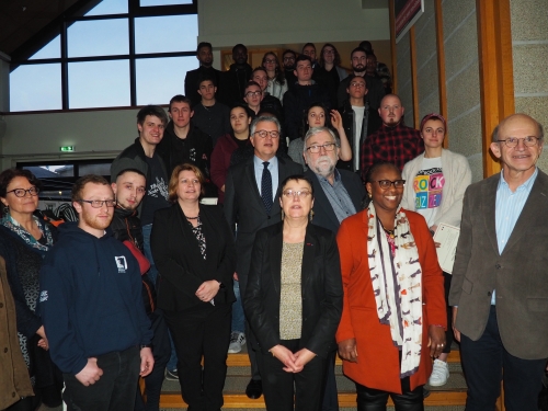 Le 12 février 2018 a eu lieu la Cérémonie de Valorisation des Filières Professionnelles, à la Maison du Département à Quimper. PDF : Cliquez ici Comme chaque année maintenant, quarante élèves du Finistère ayant décroché leur CAP, BEP ou Bac Pro ont été sélectionné par les équipes éducatives de leur établissement. Les élèves sont choisis pour leur parcours méritant et inspirant, ils mettent en valeur les formations professionnelles et ont su montrer une implication remarquable, un comportement exemplaire, et ont surmonté les difficultés rencontrées. Certains jeunes ont dû surmonter des épreuves particulièrement difficiles, ayant une situation familiale ou personnelle compliquée. Ces élèves ont reçu, sous les applaudissements de leurs proches, un diplôme créé et édité par la Direction des Services Départementaux de l’Éducation Nationale pour les récompenser et valoriser leur parcours. Ils ont représenté de nombreux secteurs, notamment les métiers de la menuiserie, de la restauration, de la maintenance automobile, du commerce, de la logistique, de la peinture, de l’industrie, de la gestion administrative, de la maintenance, de la cuisine, de la mode, de la boulangerie, de la pêche, du nautisme, de la carrosserie. Marie Gueye, Vice-présidente de Conseil départemental du Finistère, en charge de la jeunesse, Caroline Lombardi-Pasquier, Directrice des services départementaux de l’Éducation nationale, Thierry Nau, directeur du Likès, qui représentait la DDEC et Jean-François Boyard, Président de l’AJE ont ouvert la soirée par un discours sur l’importance des filières professionnelles et de l’orientation des jeunes. Ils ont bien sûr félicité tous les lauréats. Cette soirée a réuni plus de 130 personnes, venues encourager ces jeunes. Vingt neuf d’entre eux étaient présents, les autres n’ont malheureusement pas pu se déplacer, à cause d’engagements professionnels. Accompagnés de leur famille, de leurs proches, mais aussi de leurs employeurs, des chefs d’établissements, des professeurs, ils sont montés sur scène, à tour de rôle pour récupérer ce fameux diplôme que des élus et des acteurs de l’éducation nationale et de la DDEC leur ont remis après avoir lu les commentaires particulièrement chaleureux de leurs professeurs. Certains d’entre eux ont tenu à remercier, au micro, ceux qui les ont soutenus pendant leurs études. Après la remise des diplômes, les invités ont pu profiter d’un buffet organisé par le Conseil départemental du Finistère. Nous félicitons, encore une fois, les lauréats : Alexio TOMBOZARA, Matthieu SEGALEN, Vincent COADIC, Johanna RIBEIRO, Florian LANDREIN, Elisa MALTRAIT, Atiqur RAHMAN, Gaëlle FEAT, Killian DEPORTER-BERREHOUC, Maxime COUSTRE, Mamadou CISSE, Killian LAFORGE, Ibrahim GAKOU, Pierre MOYSAN, Maël RIOBE, Gabriel TROUPLIN, Yoan SALIOU, Anaïs GUENOLE, Calvin PAILLER, Ewen BONNEFOY, Romane GUILLOU, Hugo CROISIER, Maloenn SAUX, Steven BODERE, Antoine LEPEUVE, Marion BELLEY, Mickaël SIELLEUR, Sébastien LE VERGE, Ludivine PLANTEC, Juldas TESSAH TANO, Alexandre ADJIMI, Alexis JAMET, Sandy JEGO, Ludivine SCOUARNEC, Amadou BAH, Williams KEMADJOU, Maxime GUEGUEN, Ibrahim TRAORE, Chloé LE MARTELOT, Hallan ZAMUDIO. Le discours de Marie Gueye, Vice-présidente en charge de la jeunesse (Conseil départemental) Un des lauréats remercie ses proches Les élus remettent les diplômes aux élèves De nombreuses filles représentaient les filières professionnelles ! Le diplôme créé par l’Education Nationale La photo de groupe et le buffet ont clôturé la soirée